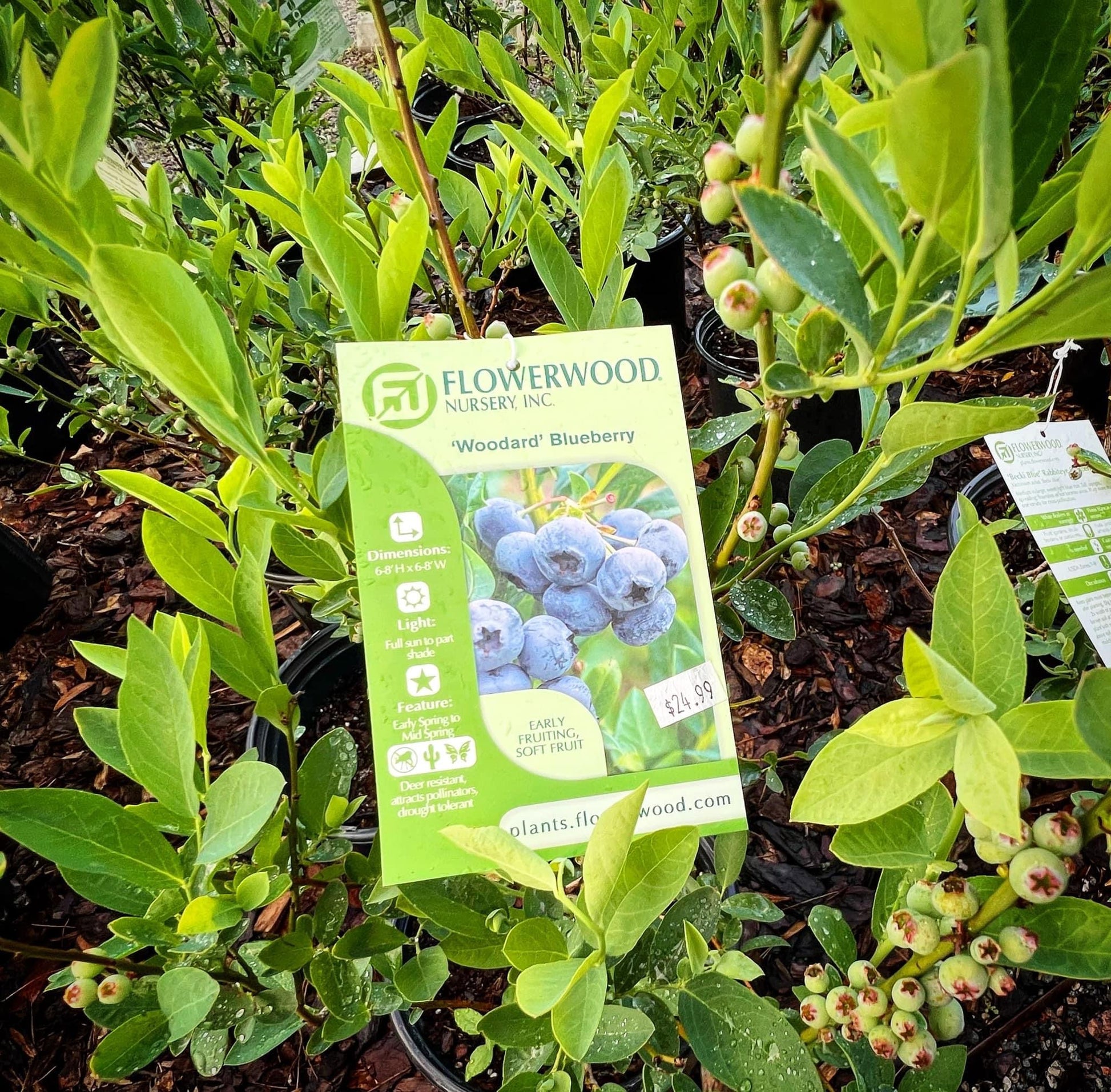 Blueberry 'Woodard' is a medium sized shrub that produces large, sweet blueberries.